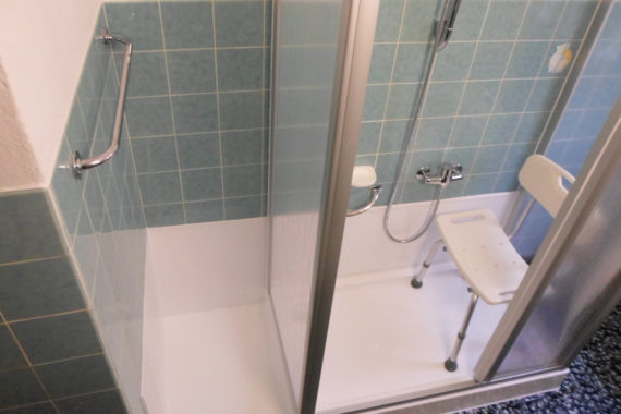 In seguito è stato posato un piatto doccia in acrilico con ribasso, creando uno spazio per un mobiletto o la cesta della biancheria. Posa della pannellatura in acrilico per rivestimento muro non piastrellato.