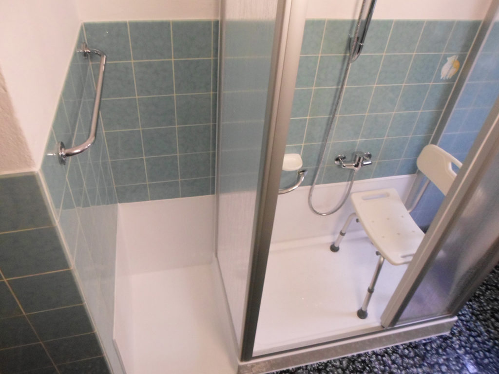 In seguito è stato posato un piatto doccia in acrilico con ribasso, creando uno spazio per un mobiletto o la cesta della biancheria. Posa della pannellatura in acrilico per rivestimento muro non piastrellato.