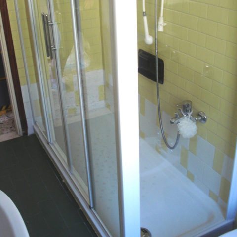 In seguito è stato posato un piatto doccia in acrilico con rivestimento integrato e la pannellatura dello stesso materiale della doccia. La pannellatura viene utilizzata per sopperire alla mancanza di piastrelle.