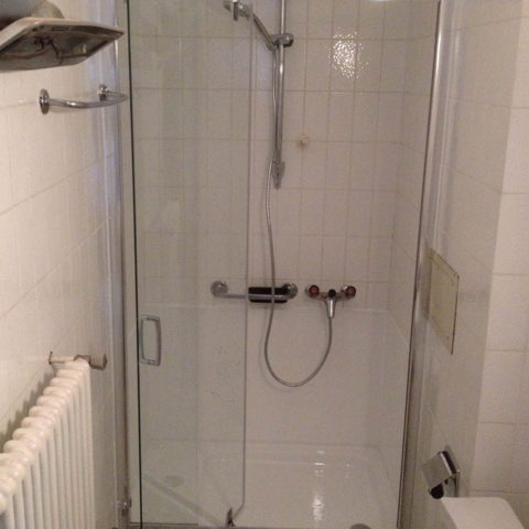 Montaggio box-doccia in cristallo con apertura frontale.