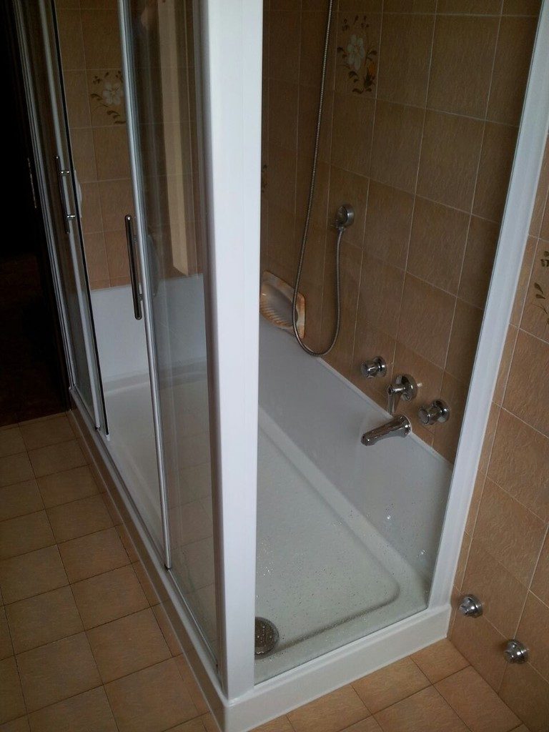 In seguito è stato posato un piatto doccia in acrilico con rivestimento integrato e la pannellatura dello stesso materiale della doccia. La pannellatura viene utilizzata per sopperire alla mancanza di piastrelle.